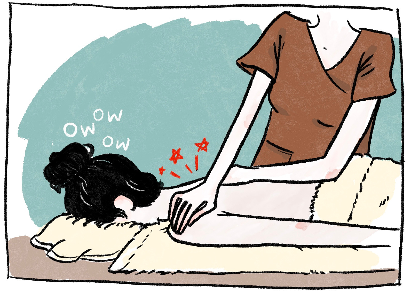 During the session, I told her to keep putting pressure—more and more—as though she could wring the ache and longing from my limbs with her knuckles and thumbs, the bony length of her forearm, the needling point of her elbow.